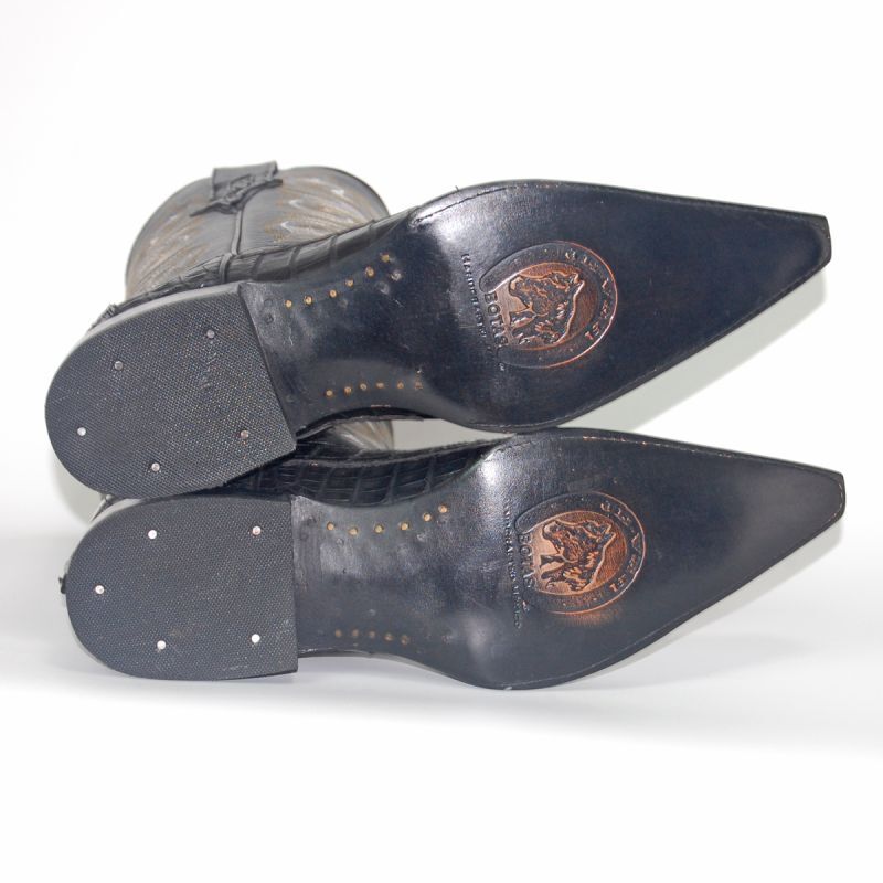 特筆すべきは、カイマンテール(ワニの尾)とポインテッドトゥのデザインです。カイマンテールの特徴的な質感と模様が、ロングブーツに豪華な印象を与えます。また、カカト部分には背びれのように施され、さらなる個性とスタイルを演出します。ポインテッドトゥは、洗練された足元を演出し、シャープな印象を与えます。頸部に刺繍が施されブーツ全体に華やかさと個性を添えます。グッドイヤーウエルト製法によって作られ、履き心地の良さと耐久性を追求しています。丁寧に作られた一足は、長く愛用できることでしょう。